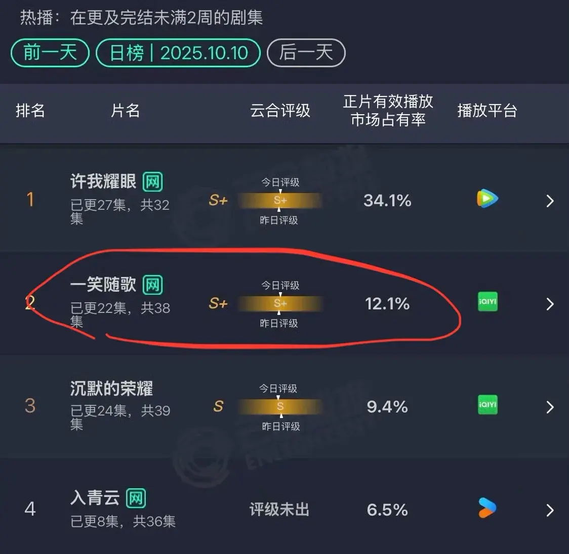 尽管如此,该剧网络声量依旧平平,热度也不行,根据云合数据显示,10月10日,《一笑随歌》占比仅有12.1%,不及《许我耀眼》的一半。