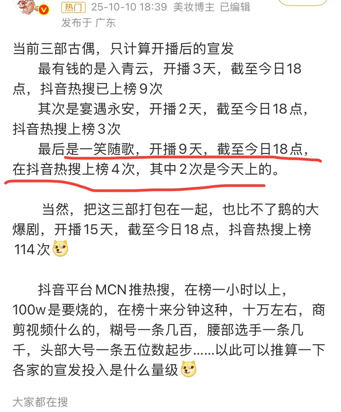 有人统计过近期新剧的宣发情况,《一笑随歌》的宣发最差,开播9天,截至10好18点,在某抖热搜上榜仅4次,真是少得可怜。