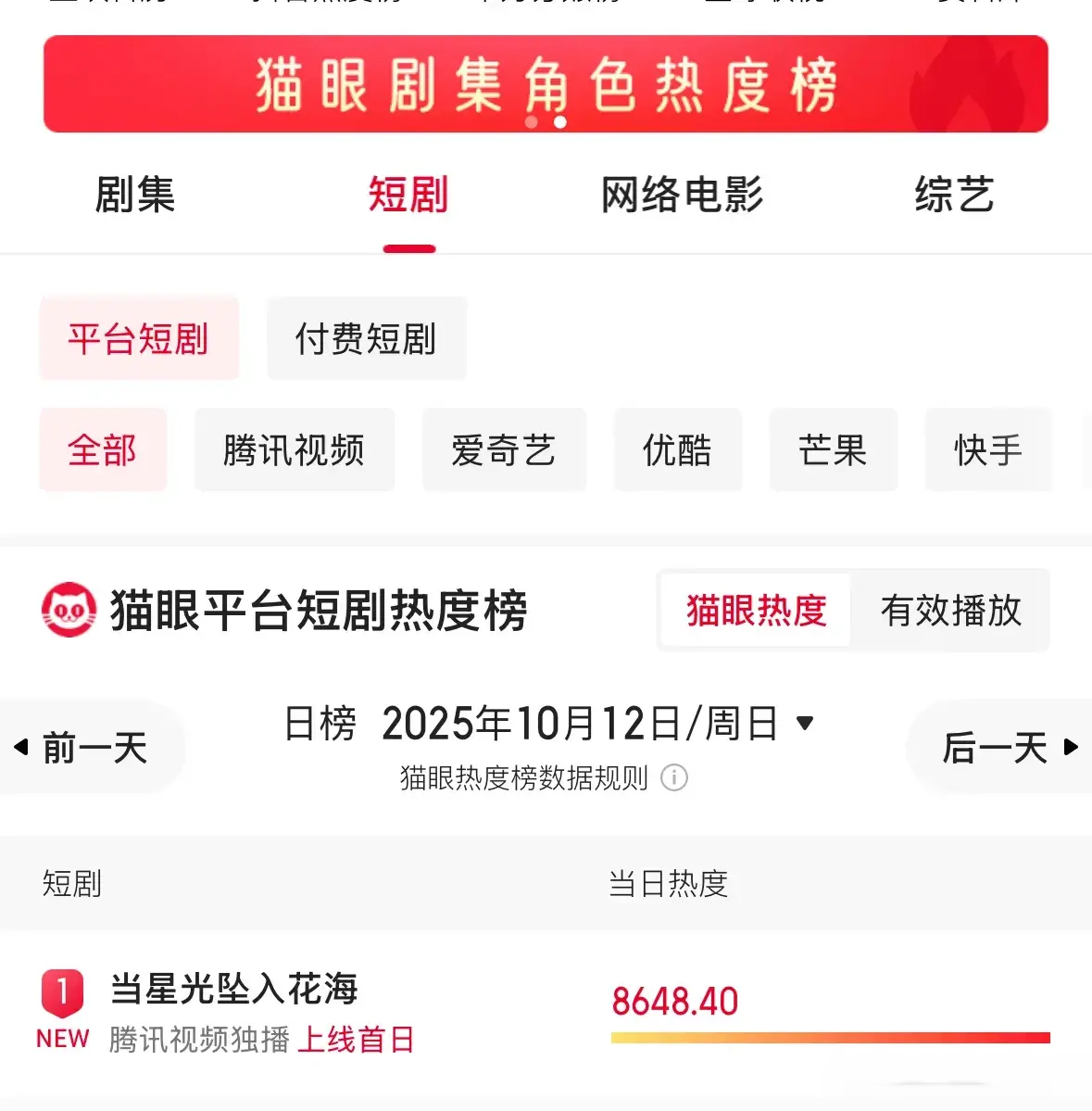 这部剧开播仅6集,首日全网猫眼平台热度8648万,登顶全网猫眼平台短剧热度榜第一。