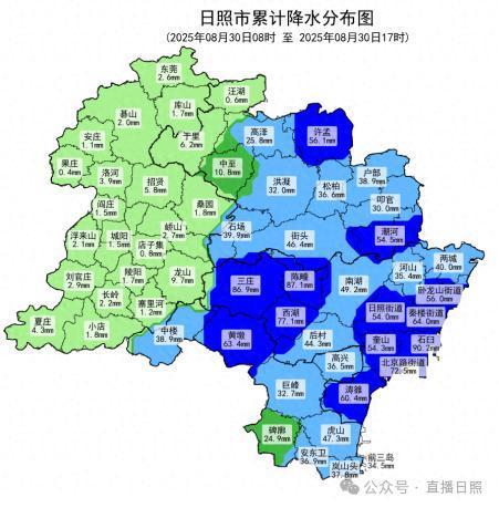 2025年08月30日08时至17时全市平均降水量32.7毫米,折合水量1.75亿立方米,降水量前三位的站点为:陈疃水文站107.5毫米,三庄水文站98.0毫米,陈疃气象站97.8毫米。